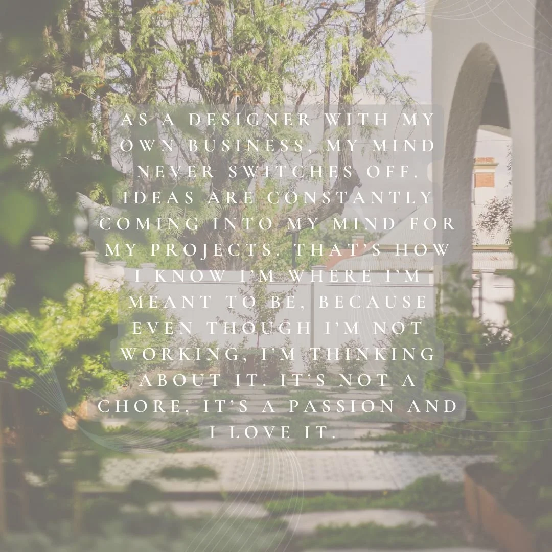 As a designer with my own business, my mind never switches off. Ideas are constantly coming into my mind for my projects. That’s how I know I’m where I’m meant to be, because even though I’m not working, I’m thinking about it. It’s not a chore, it’s a passion and I love it.